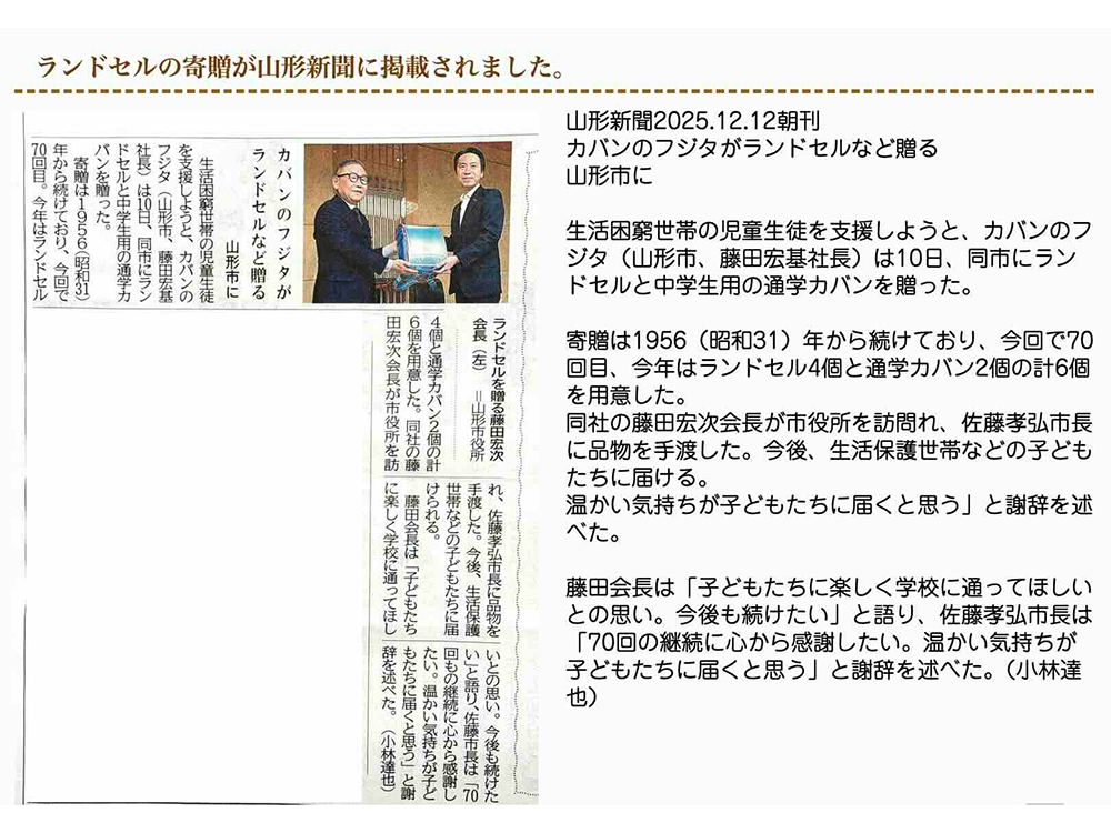 ランドセルを通したお子様への地域貢献は有名ですが、大学生への支援(山形大学)にも関わってくださりました。